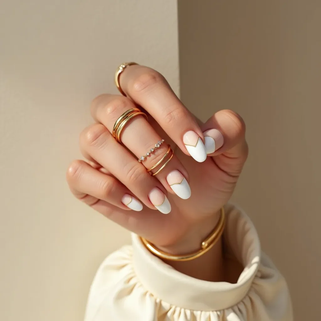6. White Almond Nails with Gold Detail