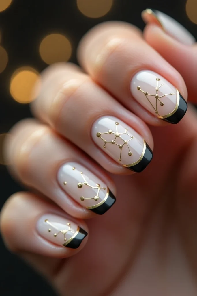 Soft nude polish forms a smooth and elegant base that feels clean and modern. Classic black tips add contrast and structure, giving the manicure a refined edge. Gold constellation details rest delicately on each nail, creating a celestial inspired design. Fine lines and tiny dots shimmer under the light, adding depth and visual interest. Square shaped nails keep the look polished and balanced. Warm background lights enhance the glow of gold accents, making this style feel festive and luxurious for New Year celebrations.