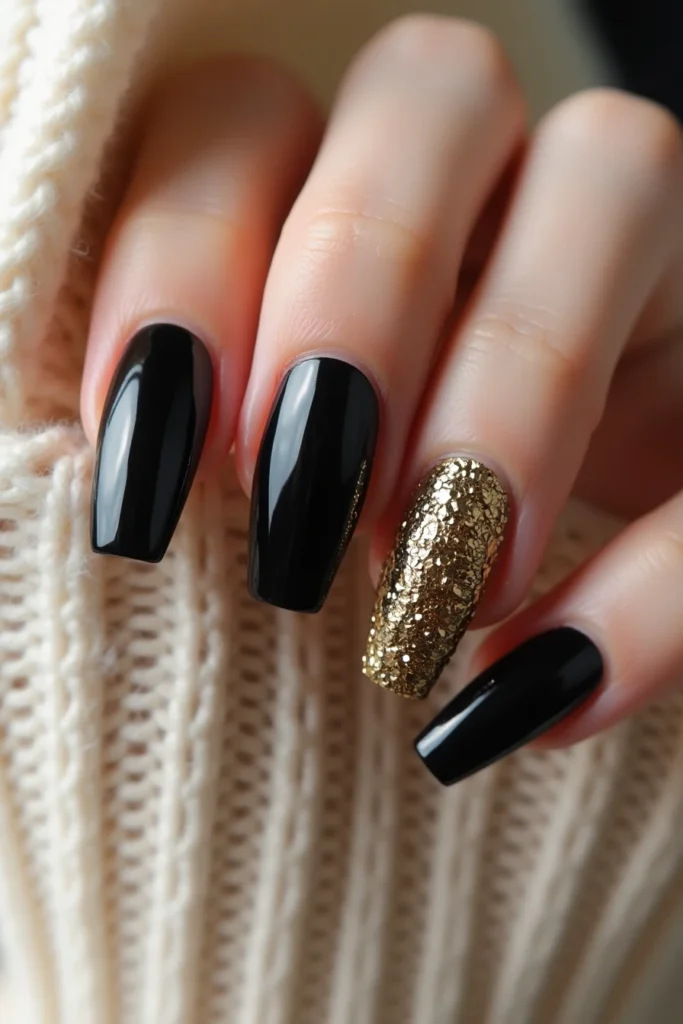 Glossy black nails create a dramatic base that feels bold and confident for New Year celebrations. The rich shine reflects light beautifully, giving each nail a sleek and polished look. One accent nail steals attention with dense gold glitter that adds warmth and sparkle. Long square tips enhance elegance and bring balance to the design. Soft knit textures nearby highlight the contrast between cozy and glamorous. This manicure feels powerful yet stylish, making it a strong choice for evening events.
