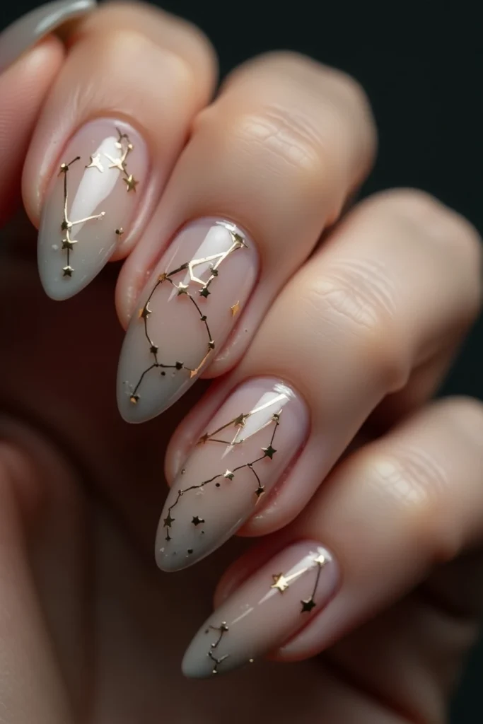 Soft nude polish creates a calm base that lets the details shine. Fine gold star accents trace gentle constellation patterns across each almond shaped nail. Thin metallic lines connect the stars, adding a dreamy and artistic touch. The glossy finish reflects light and enhances every detail. Subtle contrast between nude tones and gold elements keeps the look elegant. This design feels inspired by night skies and quiet wishes. New Year nail ideas like this bring beauty with meaning and charm.