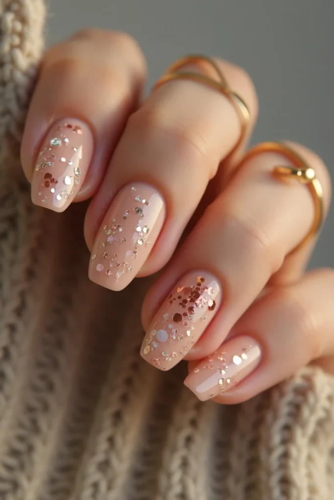 Soft nude shades create a warm and inviting base for this New Year nail idea. A translucent blush tone allows the natural nail to glow through. Scattered champagne glitter adds sparkle that feels celebratory yet graceful. Light catches the tiny flecks with every movement of the hand. Square shaped tips bring balance and structure to the look. Gold rings and cozy textures enhance the overall charm. This style feels effortless while still turning heads during festive moments. Subtle shine keeps the design refined and wearable for long evenings.
