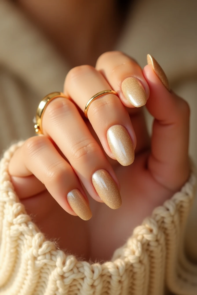 Warm gold shimmer coats these nails with a soft, radiant finish that feels rich and inviting. Light reflects gently across the surface, creating a smooth glow that pairs beautifully with cozy knits and gold jewelry. Almond shaped tips add elegance while keeping the look modern and wearable. Every movement highlights the fine sparkle, giving the nails a festive yet calm presence. This style feels luxurious without being loud, making it suitable for both intimate gatherings and elegant evenings.
