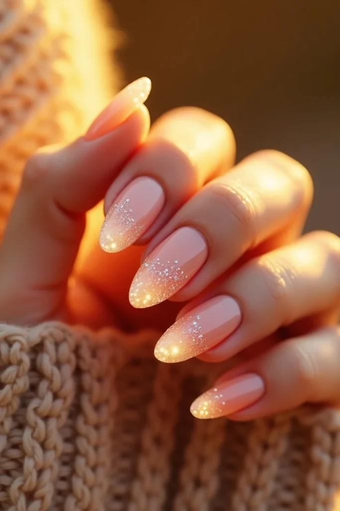 Warm nude tones melt gently into soft golden shimmer, creating a radiant New Year nail look. Almond shaped tips add grace and length to the fingers. Fine glitter gathers toward the edges, catching light like tiny sparks at sunset. A smooth gradient keeps the design delicate and refined. Cozy textures nearby enhance the glow and make the nails feel inviting. This style feels calm yet celebratory, striking a balance between subtle beauty and festive charm.