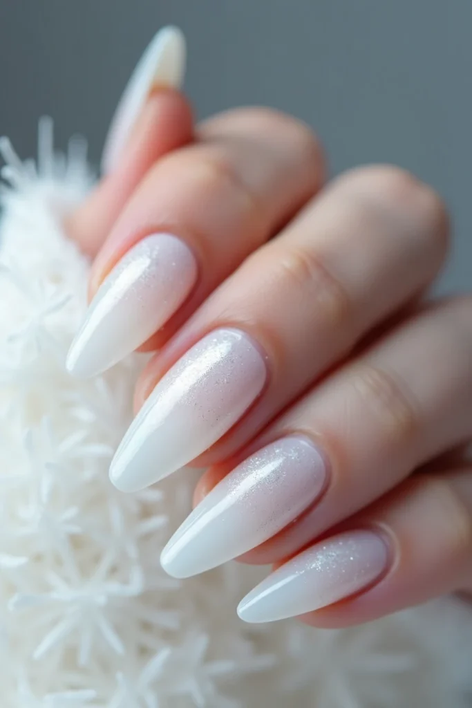 Soft milky white tones create a calm and elegant base that feels fresh for the New Year. Almond shaped nails add a graceful silhouette that flatters the hands. A delicate pearly shimmer runs through each nail, catching light in a subtle and refined way. The finish looks smooth and luminous, giving a clean and polished appearance. Gentle sparkle enhances the natural color without feeling heavy. This design feels airy, modern, and effortlessly stylish.