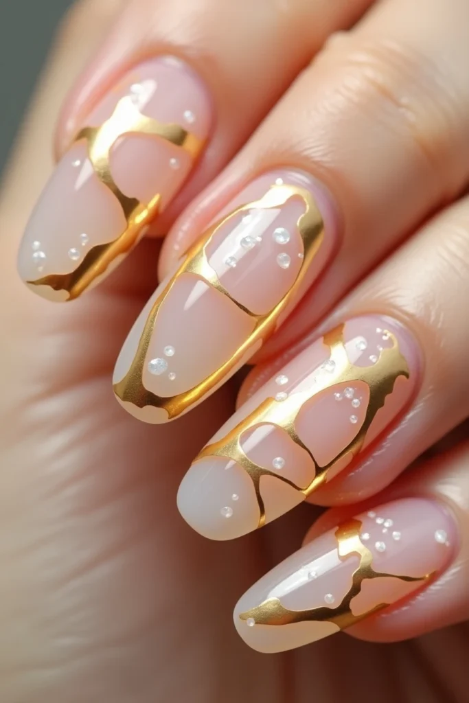 Soft nude polish lays a smooth and calming foundation for this artistic New Year nail design. Flowing gold accents move across each nail like molten metal, creating an organic and luxurious feel. Almond shaped tips add elegance and length to the hands. Tiny crystal details rest gently on the surface, adding subtle sparkle without excess. The glossy finish enhances depth and shine, making every curve stand out. This look feels modern, expressive, and refined, perfect for festive moments that call for something unique.