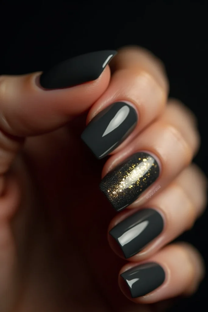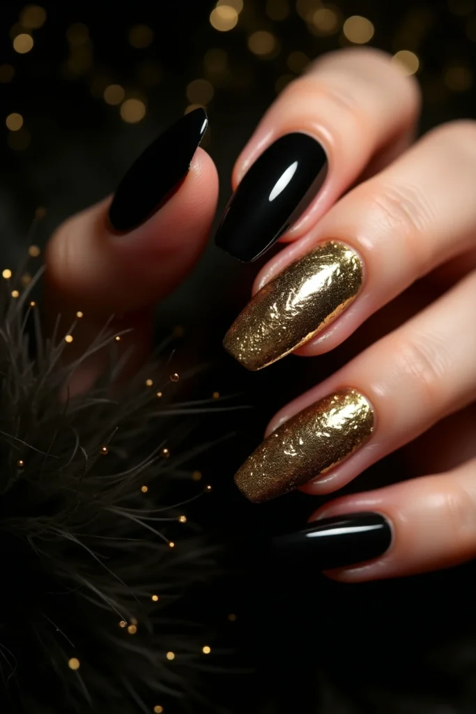 Celebrations come alive with nails that feel powerful and expressive. Gold accents bring warmth to the dark palette without overpowering it. Each nail feels intentional and balanced. New Year nail ideas often favor contrast, and this look delivers drama with grace. Evening outfits pair effortlessly with this manicure. Subtle sparkle adds movement and interest. This style feels bold, polished, and ready to step into a confident new chapter.