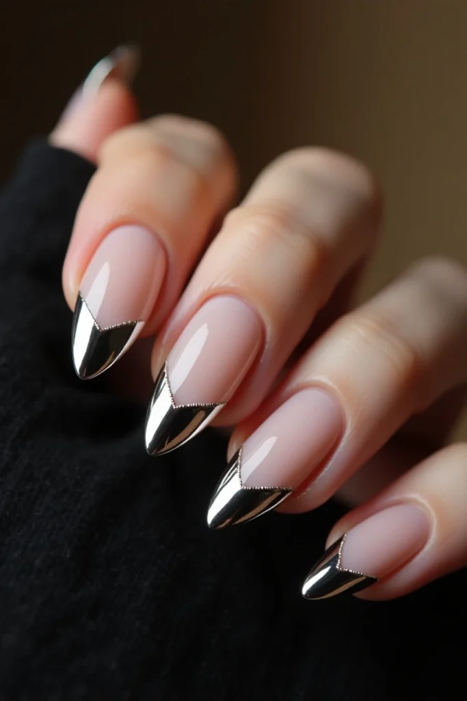 Soft blush tones set the mood for a chic New Year manicure. A sheer nude base keeps the look clean and polished. Sharp V shaped tips steal the spotlight with glossy black chrome shine. Light reflects off the metallic edges, adding drama without excess. Almond shaped nails lengthen the fingers and feel elegant at every angle. This design blends modern style with classic French tip charm. Each detail feels intentional and refined. New Year nail ideas often lean bold, and this look delivers confidence with restraint. Glamour shows through the contrast of soft pink and dark chrome. Evening outfits pair beautifully with this manicure. Minimal jewelry lets the nails speak. Celebrations feel elevated with such a sleek finish. Trend lovers will enjoy how timeless and fresh this style appears.