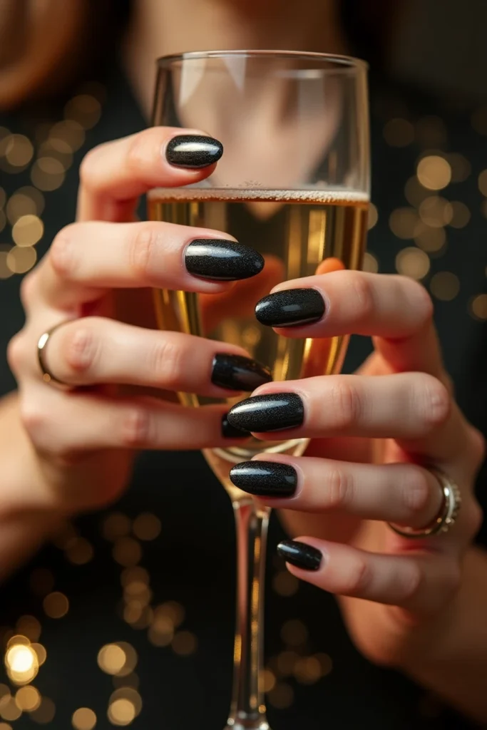 Dark elegance takes center stage with glossy black nails dusted in fine shimmer. The soft sparkle reflects warm party lights, creating a subtle glow that feels rich and confident. Almond shaped tips keep the look sleek while enhancing the length of the fingers. Against a champagne glass, the deep tone feels bold yet refined. This design captures the mood of late night celebrations and stylish countdown moments.