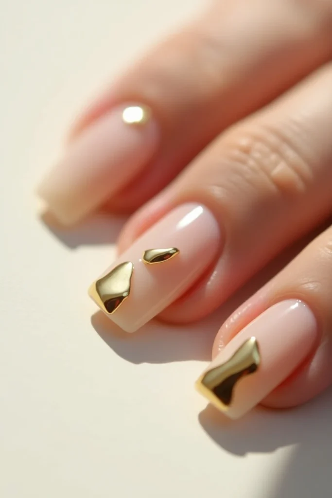 Soft nude tones create a clean and polished base that feels fresh and modern. Small gold accents add a refined touch, catching the light without overpowering the look. The glossy finish keeps the nails looking smooth and elegant, while the subtle metallic details bring quiet luxury. Short square tips enhance the simplicity and make this design easy to wear. Every element feels intentional, calm, and beautifully balanced.