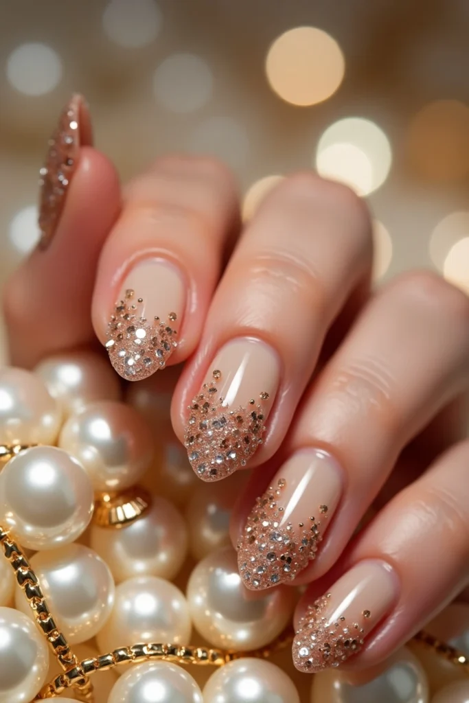 Soft nude polish sets a gentle and elegant base that feels warm and festive. Rose gold crystals cluster toward the tips, creating a glowing fade that catches every flicker of light. Almond shaped nails enhance the graceful flow of the design. Each sparkle feels intentional and refined, never overwhelming the natural tone. Pearls and golden accents nearby amplify the luxurious mood. This look feels romantic, polished, and full of celebration energy, making it a standout choice for New Year nail ideas.