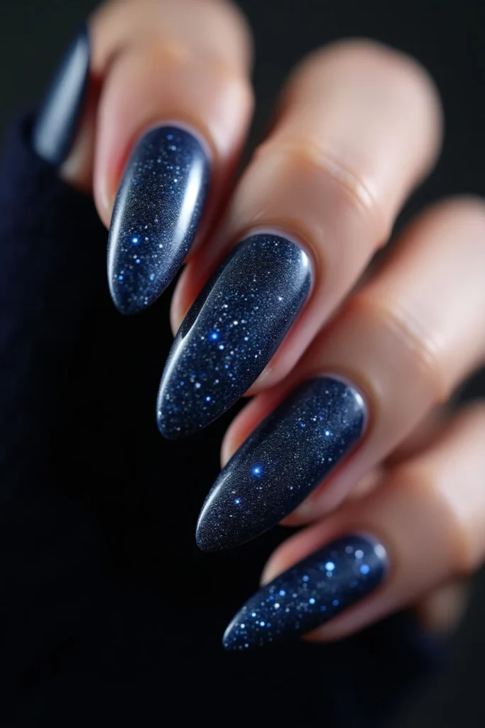 Deep navy tones shimmer with tiny specks of light, creating a look inspired by a clear night sky. Fine glitter scattered across the surface gives these nails a cosmic glow that feels bold yet elegant. The almond shape sharpens the design and adds drama without feeling heavy. Light catches each sparkle softly, making the color shift with every movement. This style feels mysterious, festive, and striking under evening lights.