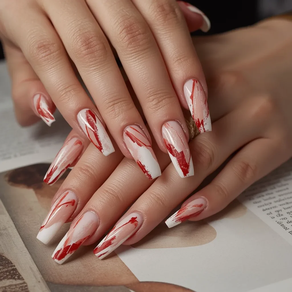 This design uses painterly strokes to form the French edge. White sweeps across the tip in soft arcs, while red brush marks intersect with organic energy. On long coffin nails, the look feels artistic and expressive, like miniature canvases. Each nail is slightly different, creating a curated, fashion-forward effect. It’s perfect for Valentine’s season because it conveys emotion through movement and texture rather than symbols. The balance of clean base and freeform tips keeps the manicure wearable yet distinctive. Ideal for creatives and trendsetters, this style feels modern, personal, and beautifully intentional.