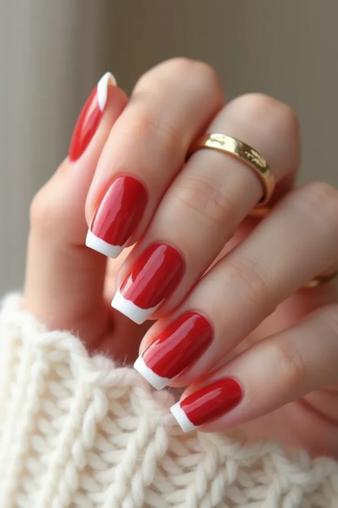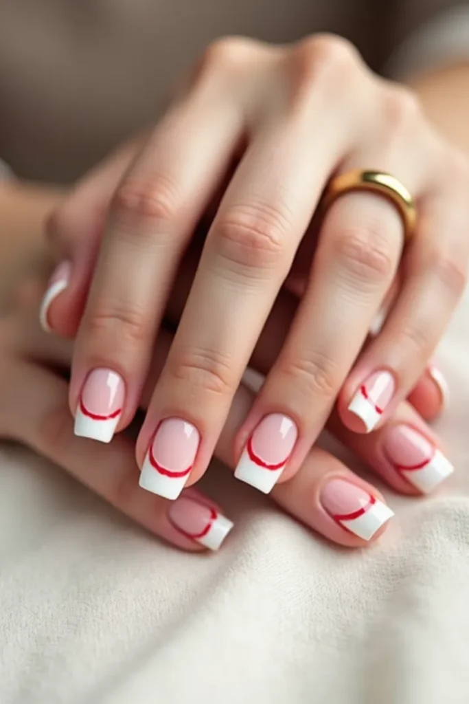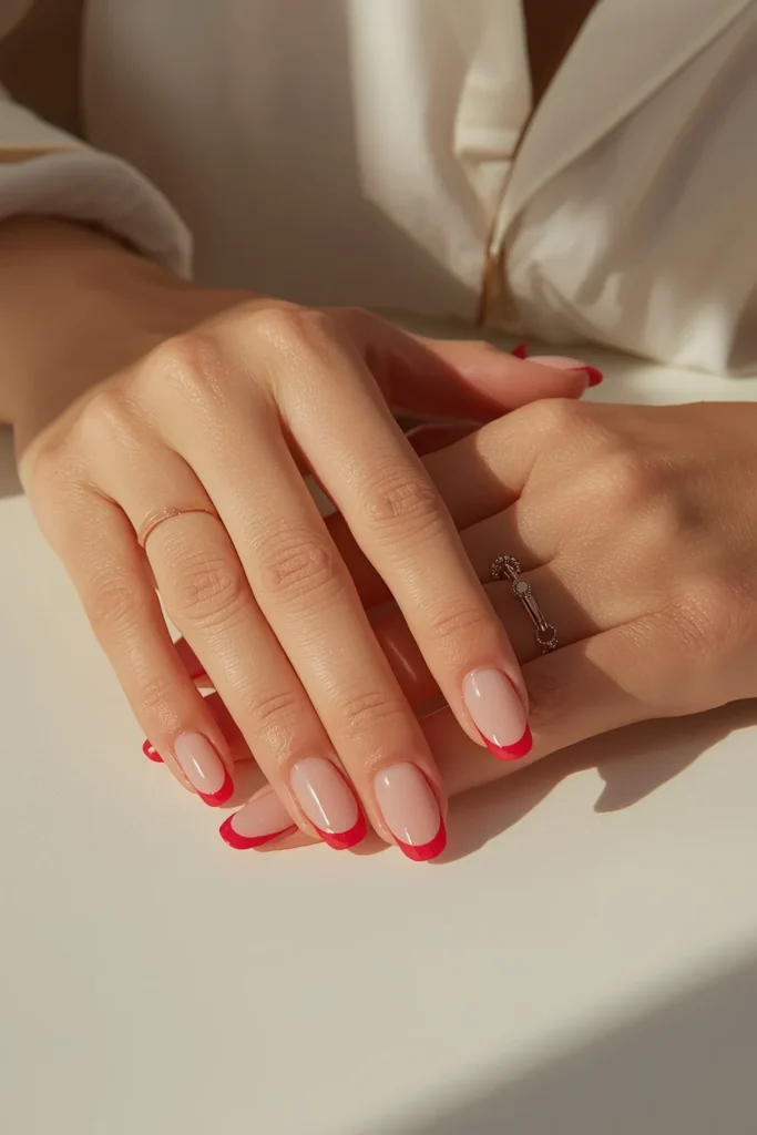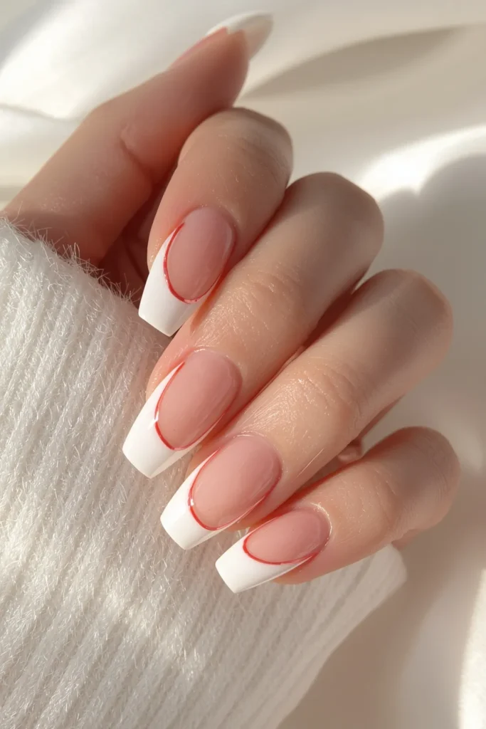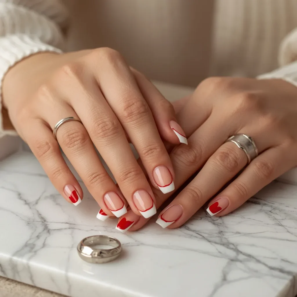 The most restrained of all, this look features barely-there white tips with a single red hairline tracing the edge. On short rounded nails, it feels airy, fresh, and impossibly chic. The design almost disappears at a glance, revealing its beauty through subtlety. It’s perfect for Valentine’s season for those who love whisper-light romance and clean aesthetics. The red becomes a signature rather than a statement, adding emotion in the quietest way. This manicure feels like a fresh start—polished, modern, and effortlessly elegant, ideal for everyday wear with a romantic undertone.