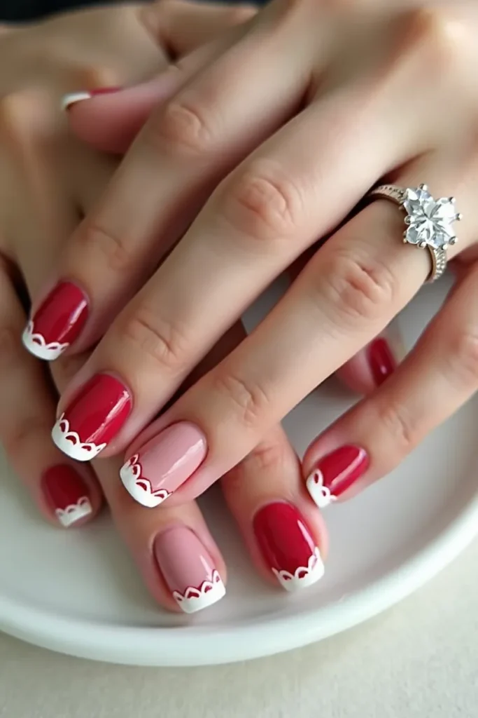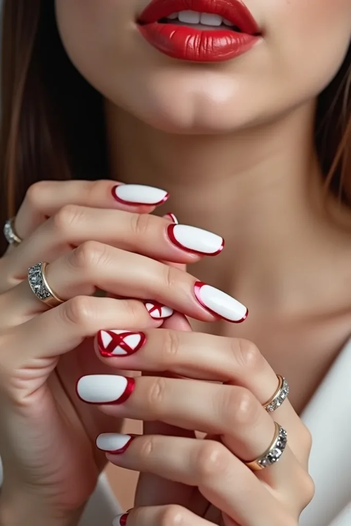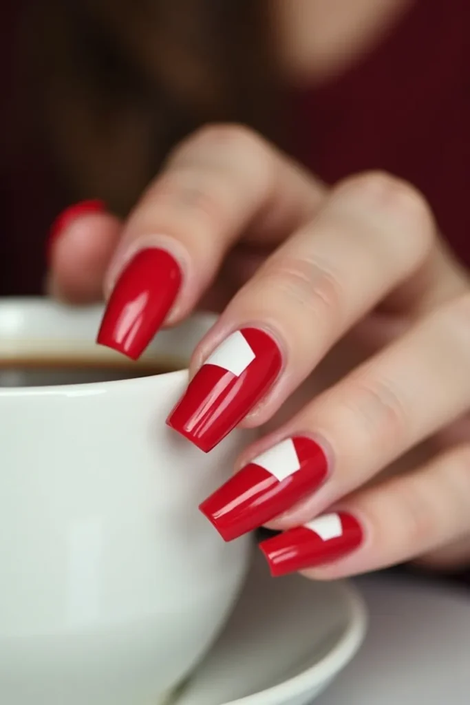 Here, the French tip breaks into angular fragments. White shards form the base edge, while red geometric pieces interlock along the tip line. On medium square nails, the design feels bold yet controlled, like modern art in miniature. The contrast between soft base and sharp detailing creates visual intrigue without clutter. It’s perfect for someone who wants a Valentine manicure that feels expressive and artistic rather than traditionally romantic. The red and white still communicate warmth and clarity, but the shape language feels new and fashion-led. This look embodies fresh energy—structured, creative, and unmistakably modern.