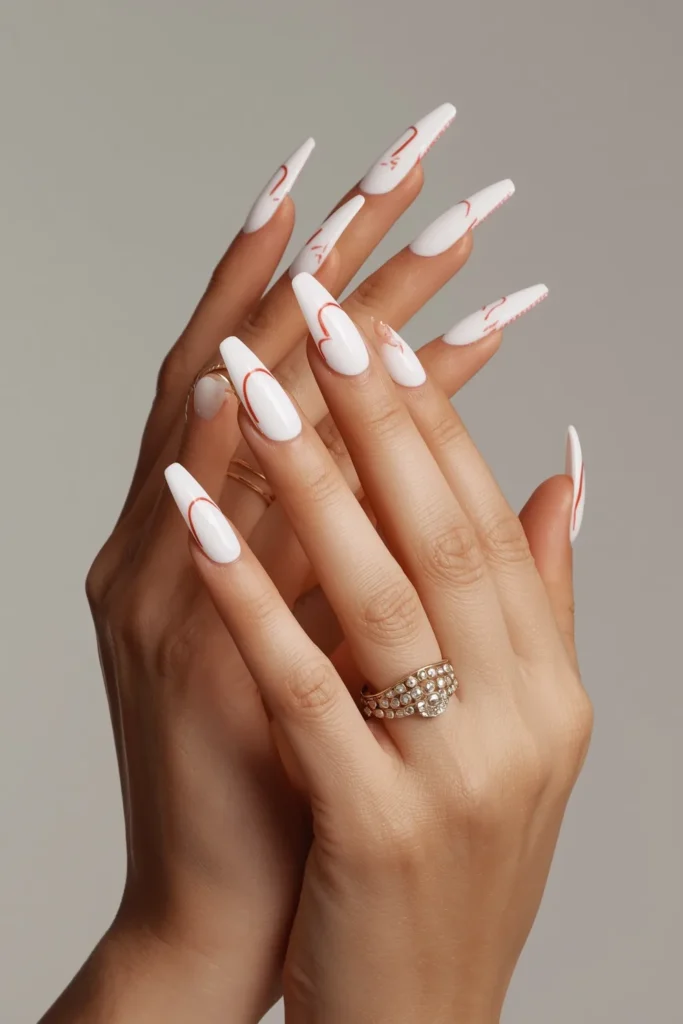 Instead of placing hearts on the nail, this design shapes the French tip itself into a soft heart arc. White curves form the base, meeting at the center in a gentle dip, while crimson outlines trace the shape for definition. On medium coffin nails, the silhouette feels graceful and architectural rather than playful. It’s romantic in a refined way—suggestive, not obvious. The heart emerges through structure, making the design feel grown and fashion-forward. This manicure is perfect for those who love symbolic details but prefer them woven subtly into the design. It transforms a classic French into something sculptural and expressive, ideal for Valentine’s season with a modern edge.