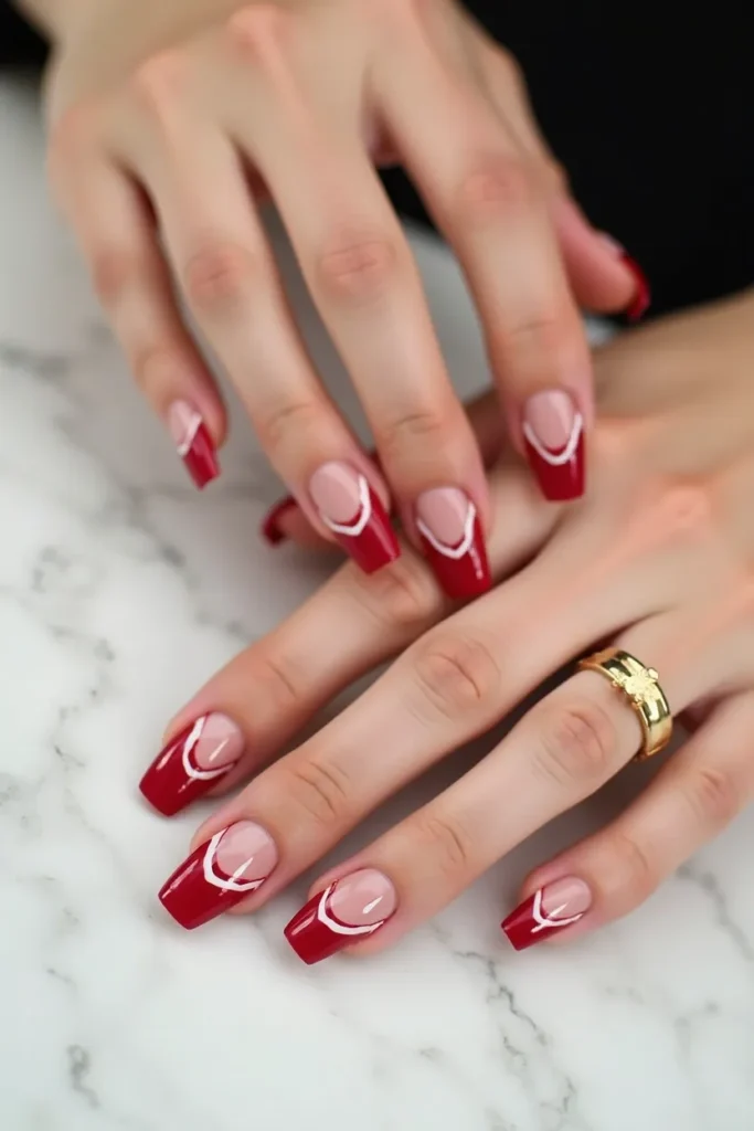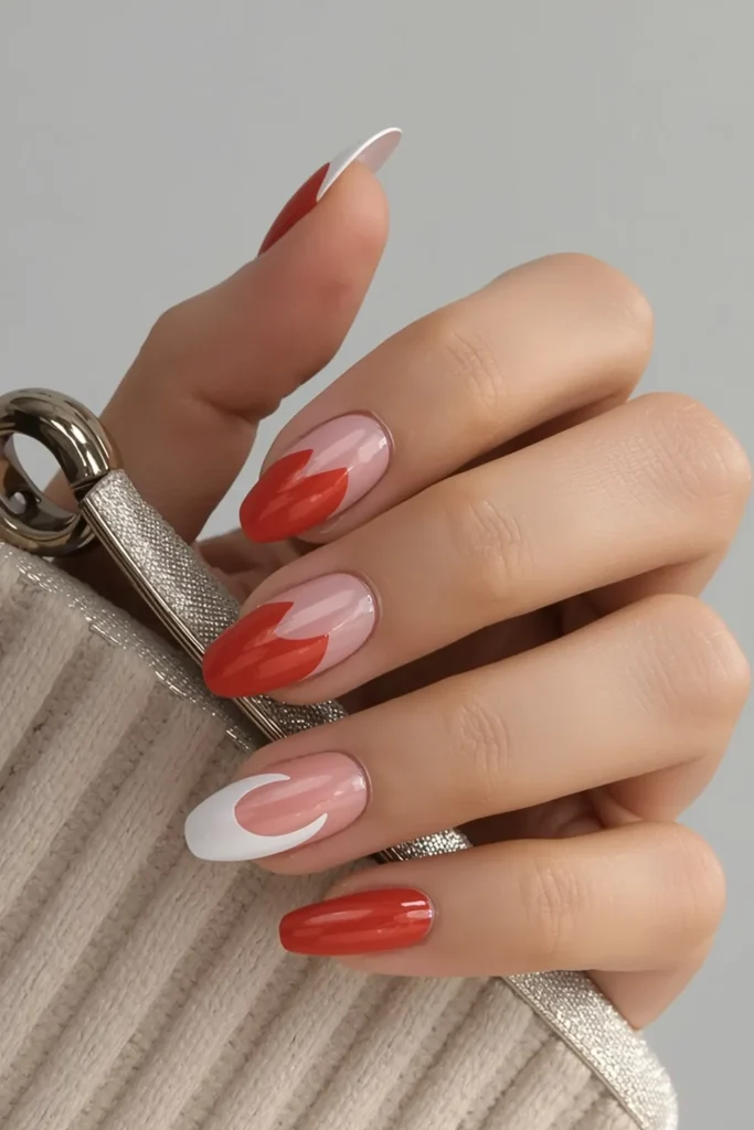 This French tip flows instead of curves. White tips ripple in gentle waves, with red tracing portions of the edge like a soft current. On medium oval nails, the movement feels organic and romantic, adding artistry without heaviness. The design feels hand-drawn, almost poetic, perfect for someone who loves subtle imperfection and fluid beauty. The red and white blend harmoniously, creating a look that feels warm, expressive, and modern. It’s ideal for Valentine’s season because it suggests emotion through motion rather than symbols. This manicure feels like quiet romance—effortless, personal, and beautifully refined.