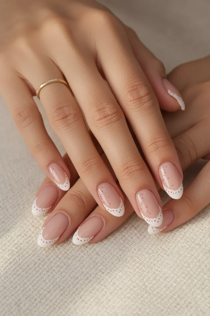 This design replaces solid lines with a constellation of tiny white dots tracing the French edge, punctuated by occasional red accents. On short almond nails, it feels delicate and airy, like jewelry for your fingertips. The dotted contour softens the structure of a classic French tip, giving it a whisper-light presence while still defining the shape. The red dots add warmth and intention, creating a subtle rhythm across the hand. It’s a perfect Valentine manicure for someone who loves fine detail and modern restraint. Romantic without being obvious, this look feels fresh, minimal, and quietly expressive—ideal for clean aesthetics with personality.