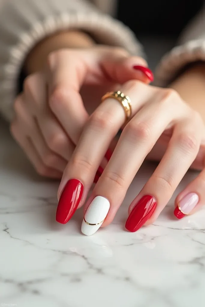 This manicure contrasts textures: a soft matte base paired with glossy red and white French tips. On long oval nails, the shine at the edge feels intentional and luxurious. The white defines the tip, while red adds warmth in thin arcs or accents. The play between matte and gloss gives depth without adding complexity. It’s a modern Valentine look for someone who appreciates detail through finish rather than pattern. The result is refined, tactile, and fashion-forward—perfect for clean aesthetics with a twist. It feels sophisticated, contemporary, and quietly romantic.