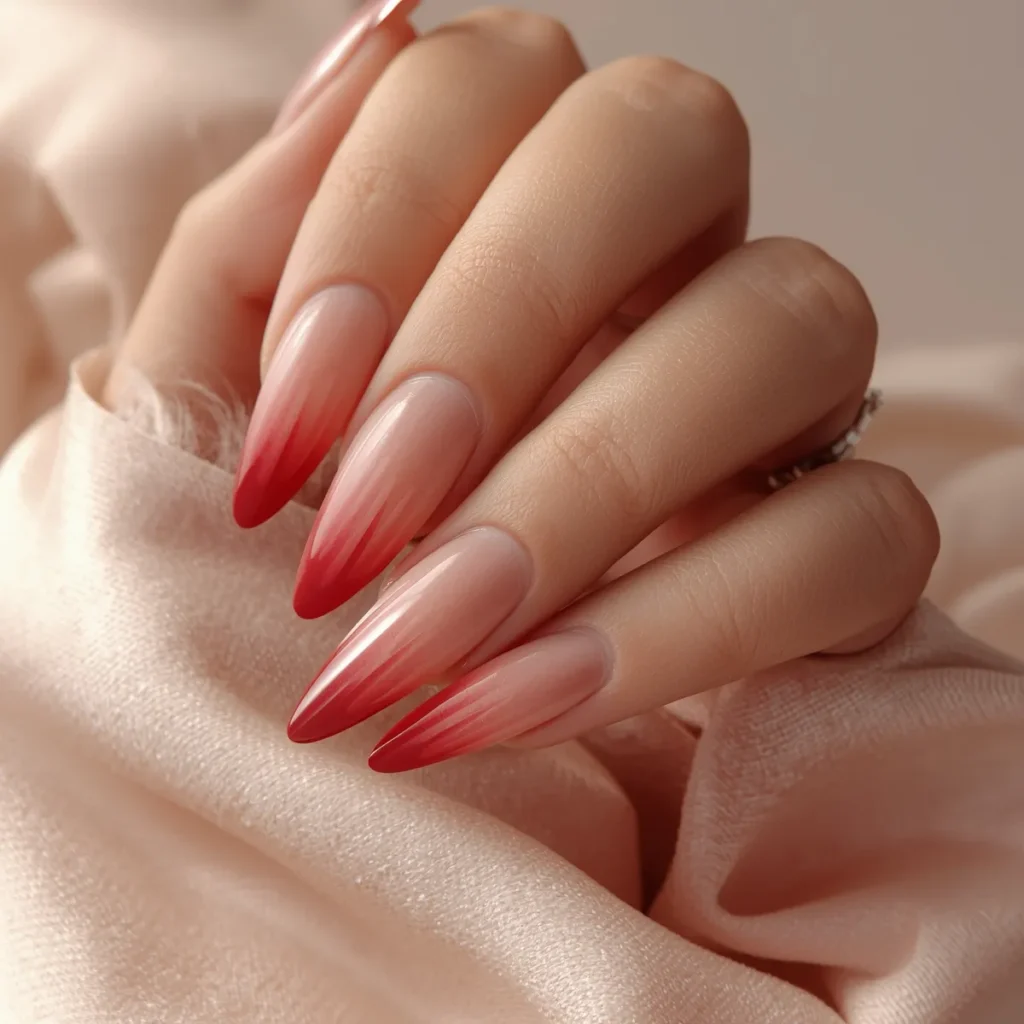 This design blends white into red at the very edge of the nail, creating a gentle gradient that replaces hard lines. On long almond nails, the fade feels romantic and ethereal, like color drifting across silk. The transition keeps the look soft and modern, offering a fresh alternative to traditional French structure. It’s ideal for Valentine’s season because it suggests emotion through subtlety—no sharp borders, just warmth melting into clarity. The manicure feels fluid, feminine, and refined, perfect for anyone who loves softness with intention. It’s elegant without formality and modern without excess.