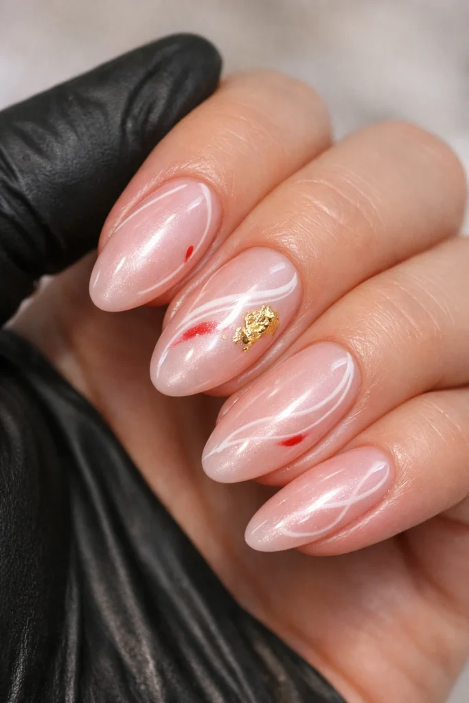 White flowing lines add movement and creativity, while small red accents and hints of gold foil introduce contrast and refined detail. The almond shape elongates the fingers, enhancing the fluid design. Ideal for special events or creative moments, this manicure blends modern artistry with soft elegance, offering a fresh, feminine look defined by subtle shine and thoughtful detail.