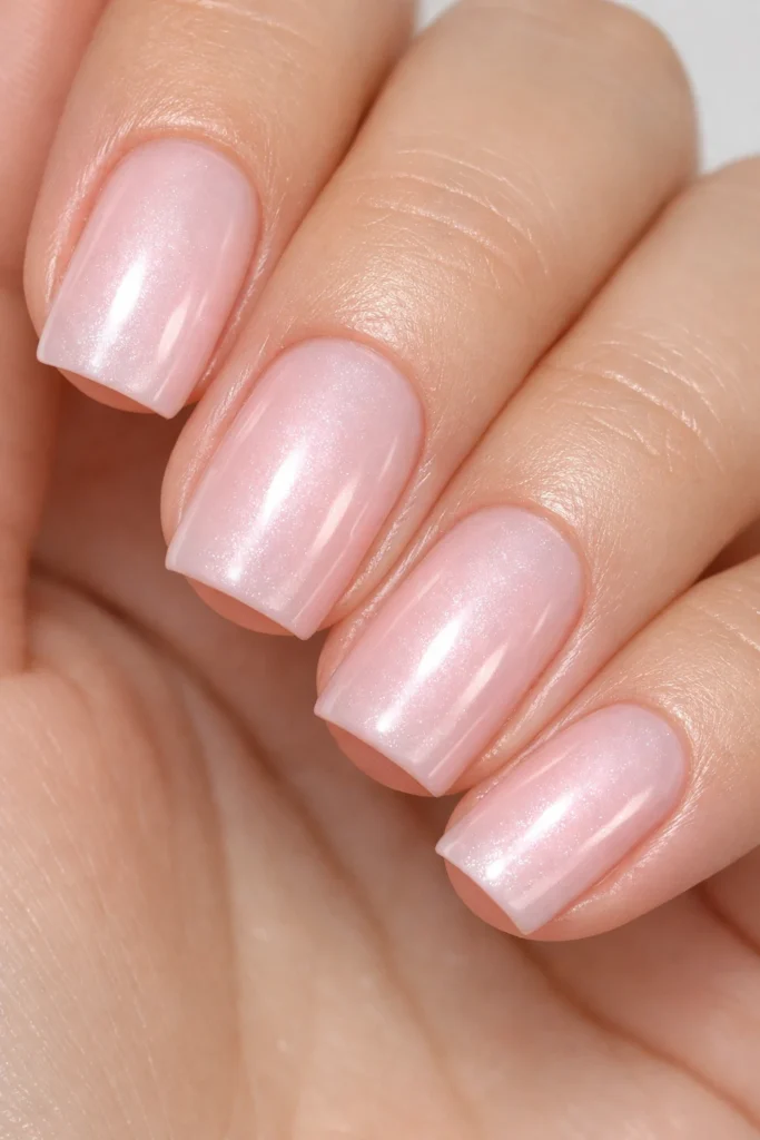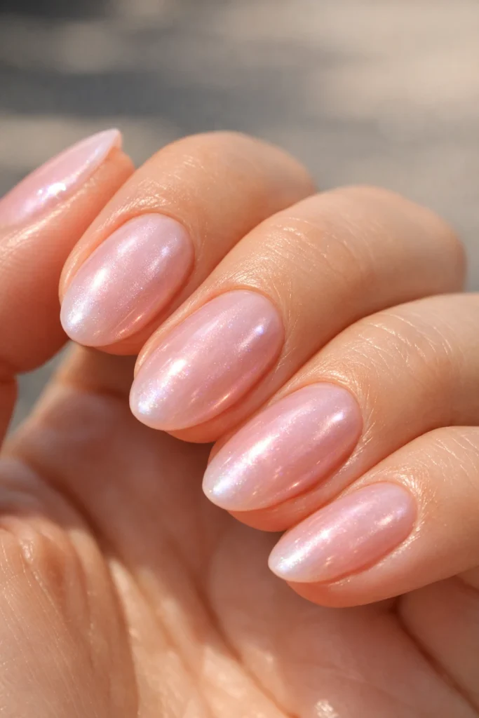Soft pink pearlized nails glow gently under natural light, creating a graceful and feminine look. The smooth blush base transitions into a pearly sheen, reflecting light softly for a clean, luminous finish that adds subtle depth without feeling bold.