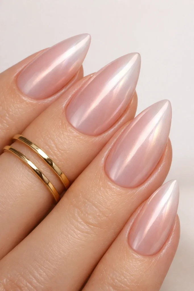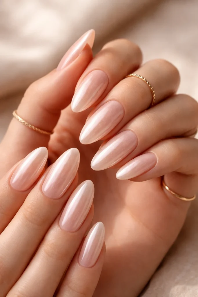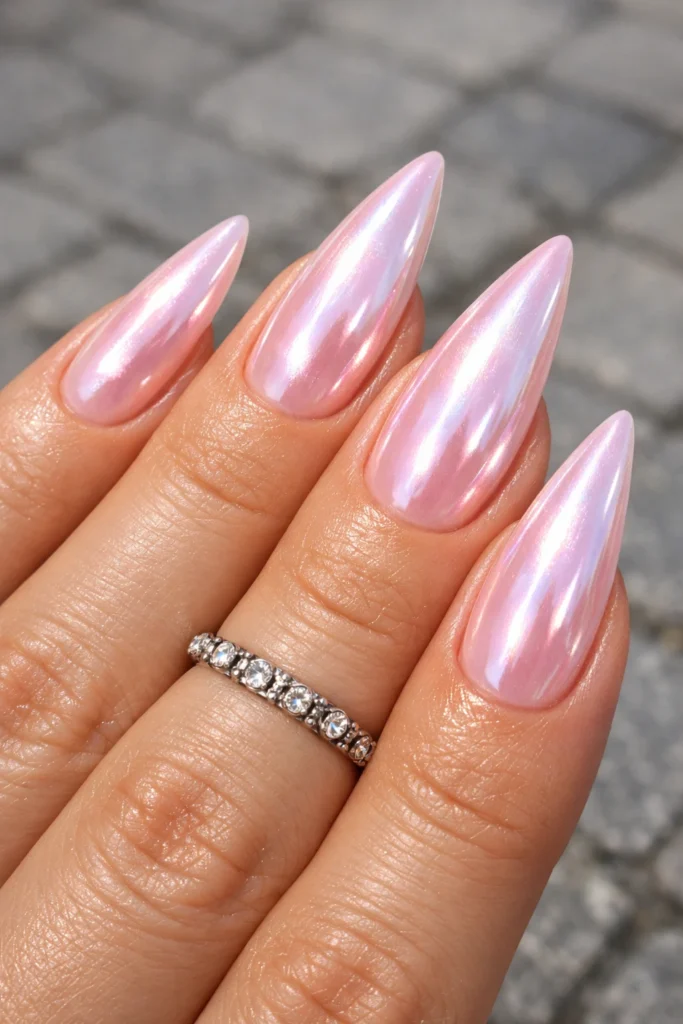 Soft pink pearlized nails glow with a silky, luminous finish, combining elegance and subtle depth. The refined pearly sheen keeps the color light and graceful, while almond-shaped tips enhance finger length and create a fluid, feminine silhouette.