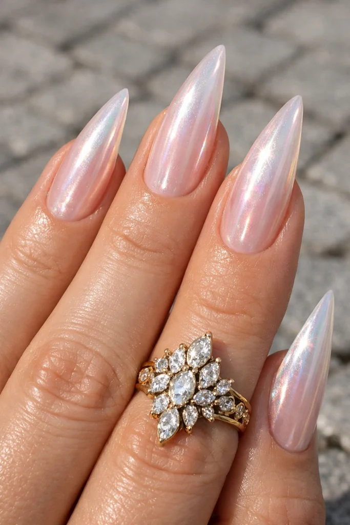 Stiletto-shaped nails feature a soft pearl base with a subtle iridescent sheen, creating delicate pastel reflections and a luminous, glass-like finish. The chrome-pearl effect elongates the nails, giving them a sleek, airy, and refined appearance.