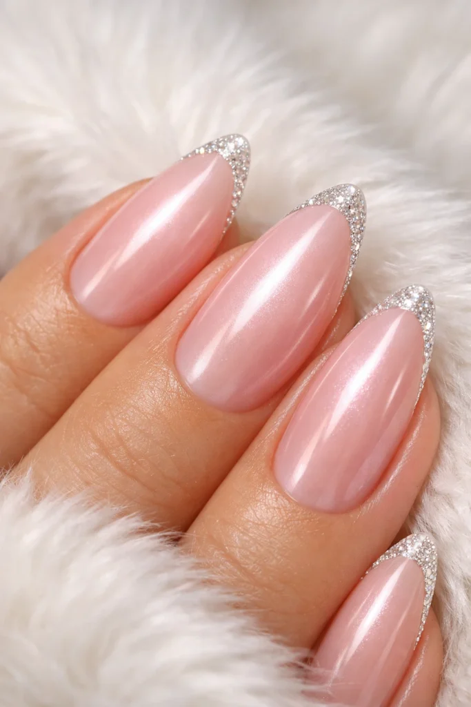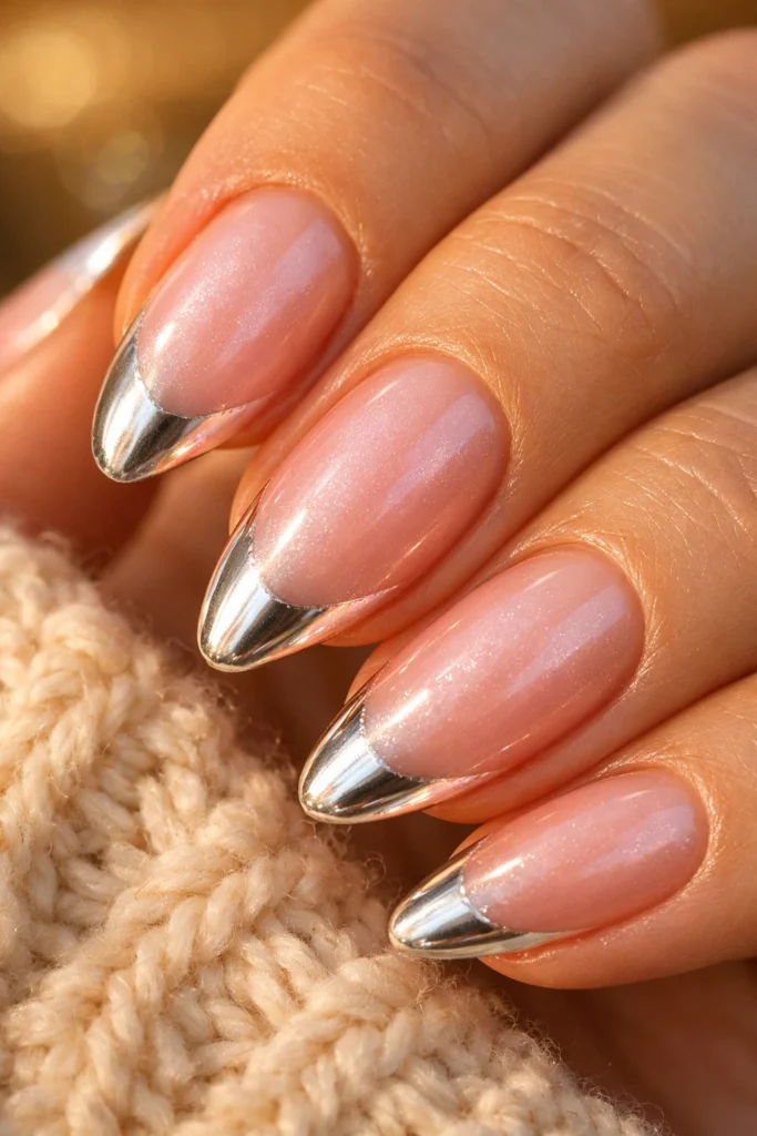 Blush pink pearlized nails blend softness with edge, featuring a luminous pink base paired with striking silver chrome tips. The pearlescent finish reflects light beautifully, creating a smooth, polished look, while the metallic accents add a bold, modern contrast.