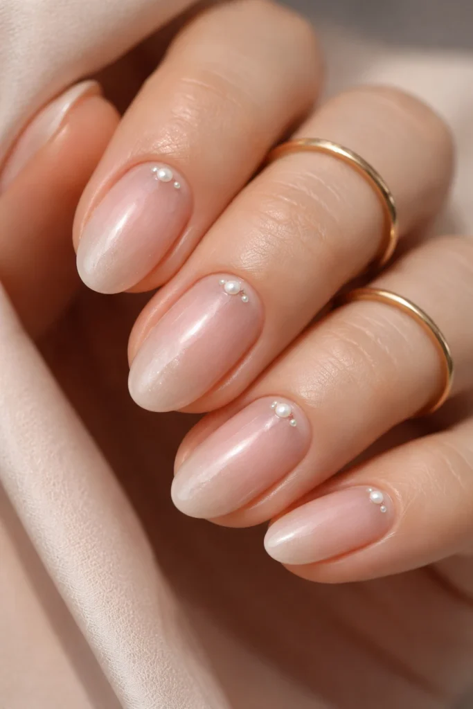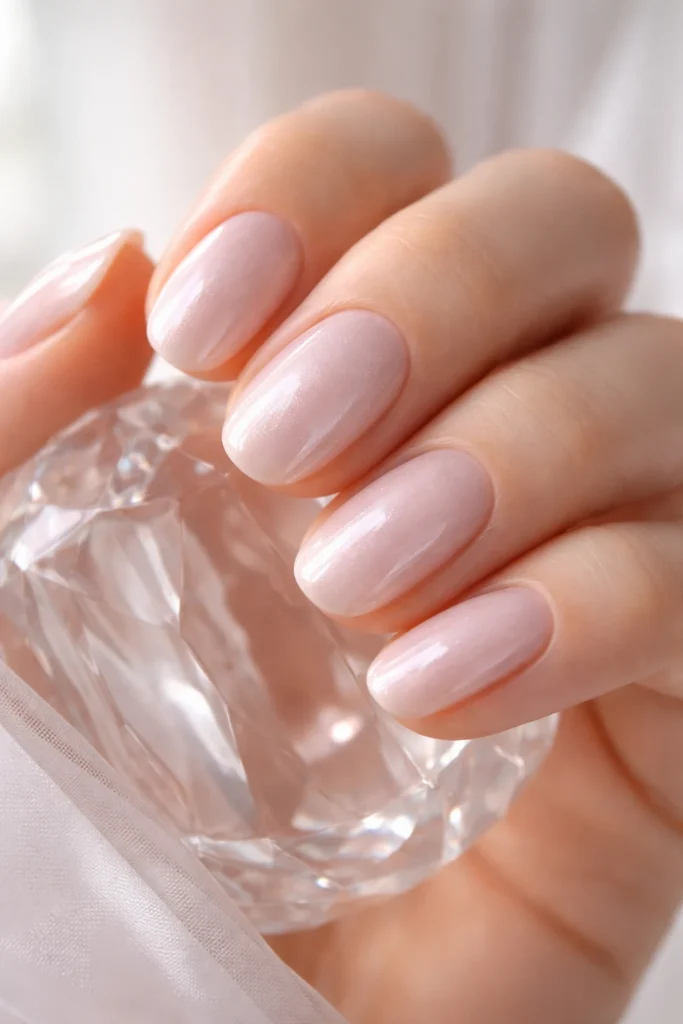 Soft blush pink pearlized nails create a calm, elegant base with a smooth, silky sheen. Gentle light reflects across the surface, giving the manicure a polished look that feels fresh, refined, and timeless.