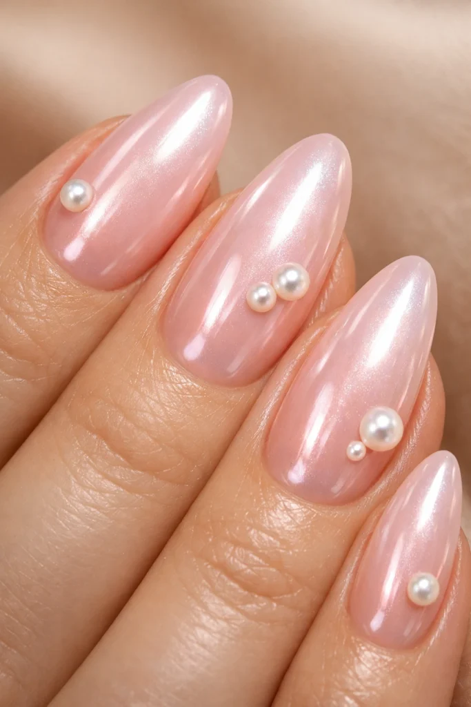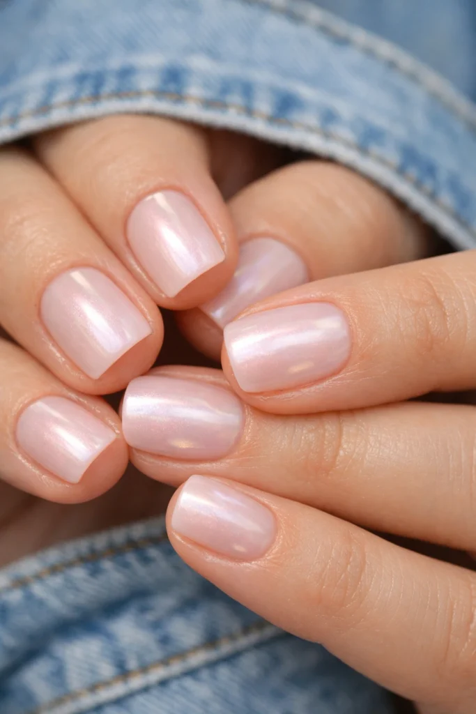 Soft pink pearlized nails shine with an opalescent glow, shifting gently between blush and pearly white. The glossy finish feels refined and luminous, adding elegance without heaviness.