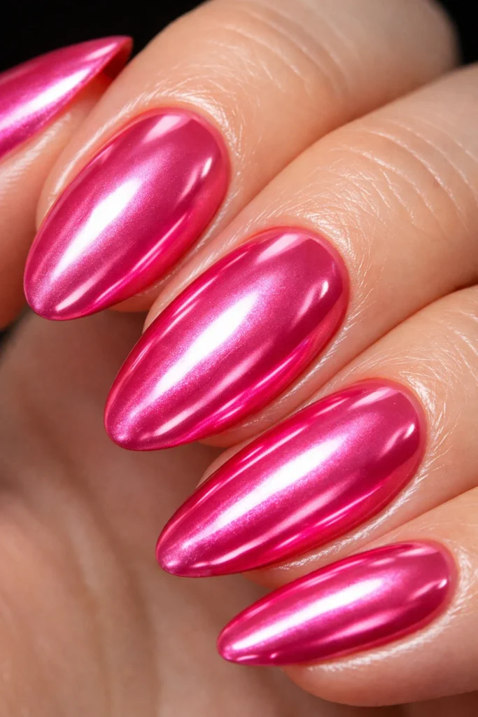 Almond-shaped nails shine with a bold raspberry pink chrome finish, featuring an ultra-glossy, mirror-like surface. The metallic sheen reflects light intensely, creating a rich, dimensional glow that feels modern, confident, and luxurious.