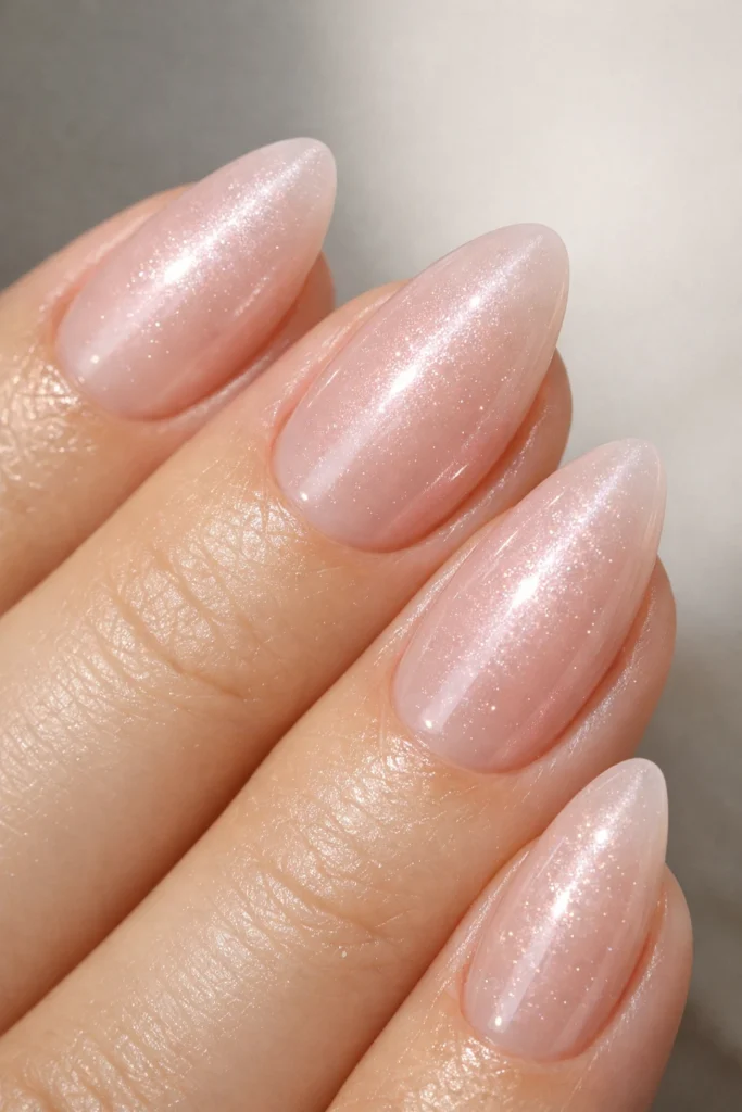 Soft pink pearlized nails create a calm and romantic look, with light gently reflecting across the almond-shaped tips. The warm blush tone blends naturally with the skin, giving each nail a smooth, luminous finish that feels effortless and refined.