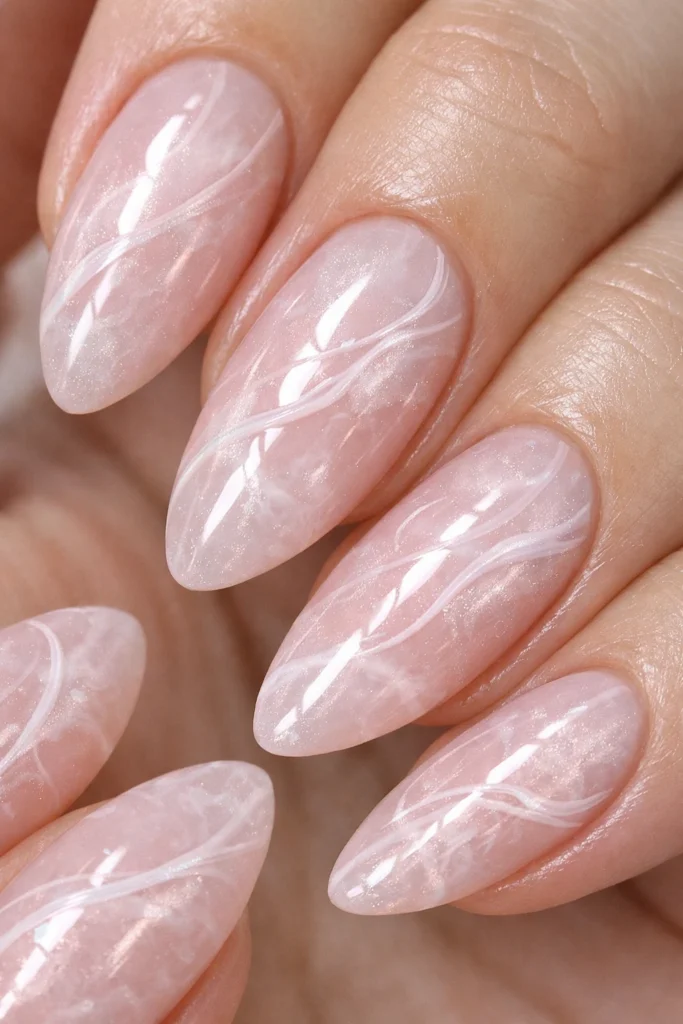 Almond-shaped nails feature a soft blush pink base with delicate marble veining that flows naturally across each nail. Translucent white swirls create an airy, elegant pattern, while fine pearlescent shimmer adds depth and a smooth, glossy finish.