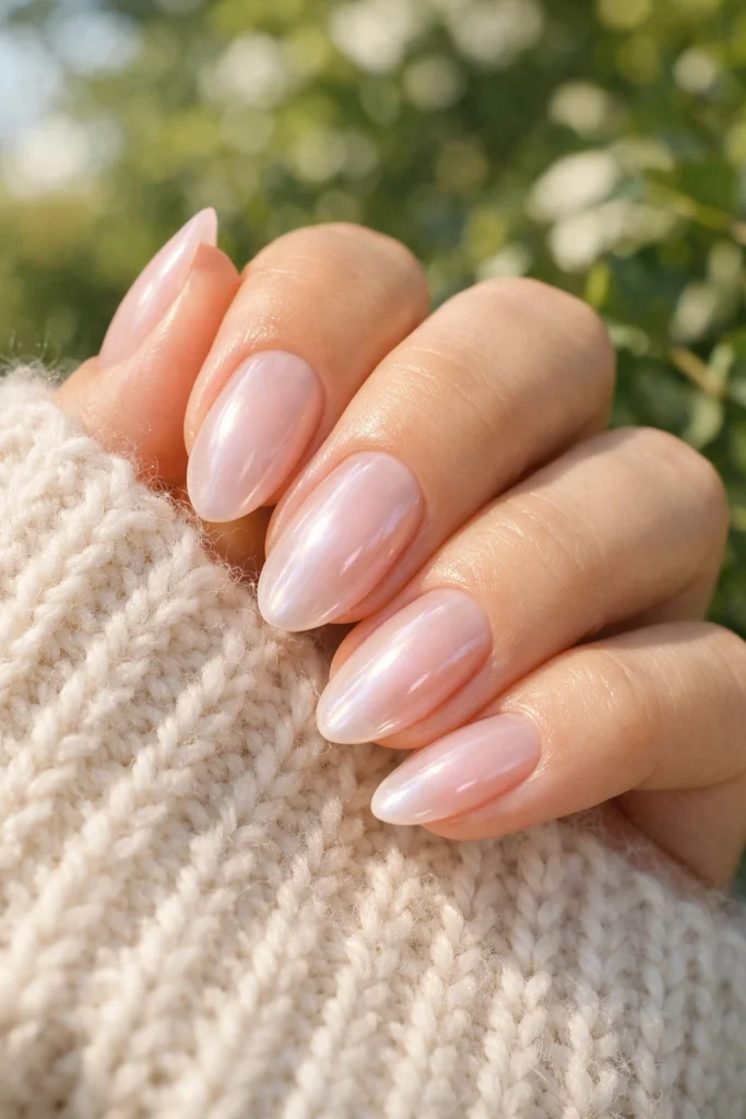 Warm daylight gives these pearlized nails a gentle pink glow that feels calm and natural. A smooth pearly sheen reflects light softly across the almond-shaped tips, while the delicate blush tone blends seamlessly with the skin for an understated, elegant finish.