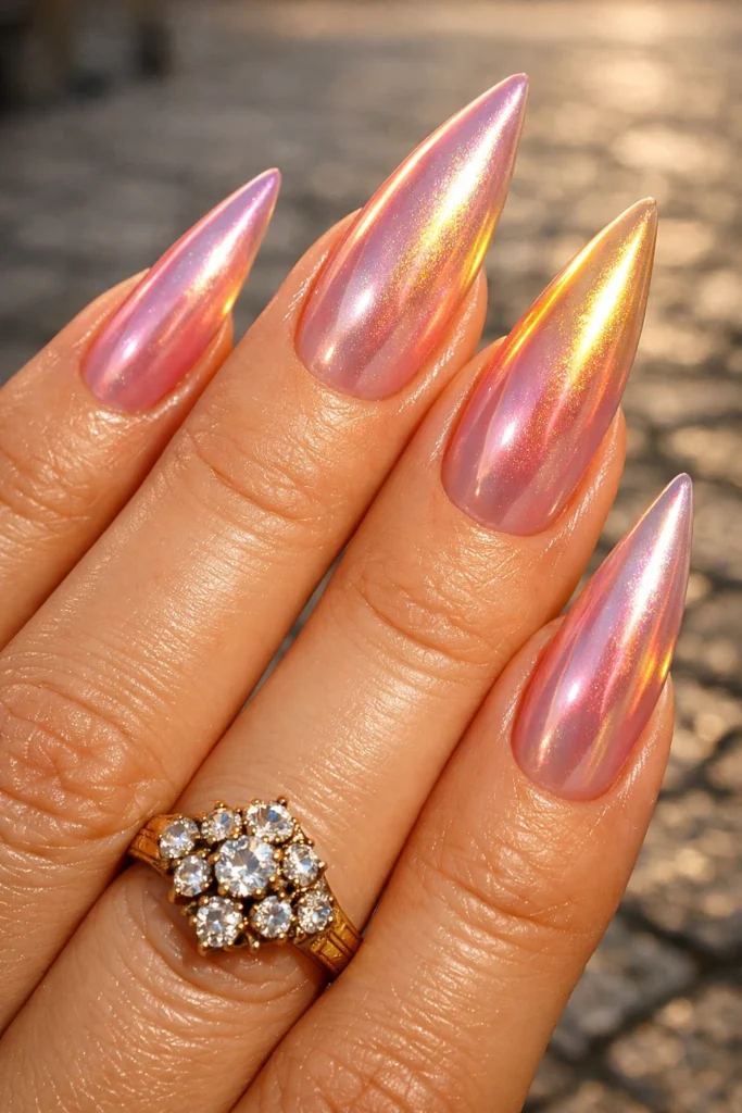 Stiletto-shaped nails feature a radiant iridescent finish that shifts between soft pink, warm gold, and subtle peach tones. The chrome-like sheen reflects sunlight beautifully, creating a luminous, sunset-inspired effect with fine shimmer and a smooth, glassy surface.