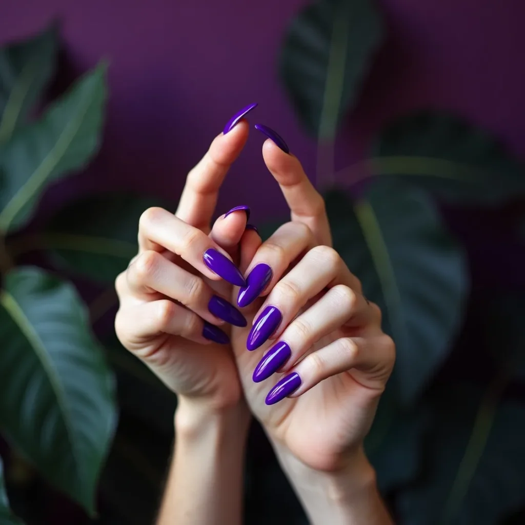 Electric violet is the one genuinely bold colour on this list — the shade that does not ask permission and does not offer a softer alternative. In spring 2026 a vivid, fully saturated violet has entered the nail conversation as the statement option for those who find the season’s pastels too quiet. On long stiletto nails with a chrome finish the electric violet becomes something closer to a fashion object than a nail colour. On medium square nails with a glossy finish it reads graphic and deliberate. Electric violet is the spring nail colour for those who want their manicure to be the first thing people notice — and the last thing they forget.