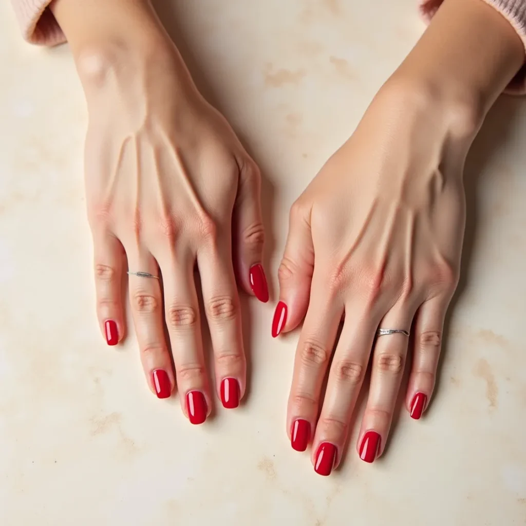 Red is not typically considered a spring nail colour, but strawberry red — the specific red with enough warmth and enough pink in it to feel entirely seasonal — earns its place on this list completely. This is not the deep berry reds of autumn or the blue-based reds of winter. Strawberry red is warm, vivid, and alive with the energy of the season, sitting in the exact register where red meets coral and becomes something entirely its own. On short almond nails with a high-gloss finish it is one of the most immediately striking spring nail colours available. On medium coffin nails with a glossy finish it carries genuine occasion weight.