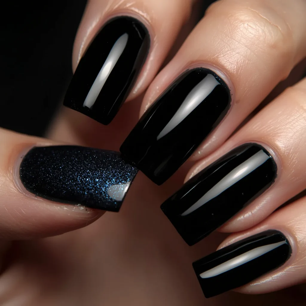Pure midnight black nails (so black they absorb light) featuring holographic micro glitter scattered subtly throughout, creating the effect of tiny rainbow fragments caught within darkness. On square or coffin nails with a high-gloss finish, this design reads as sophisticated, contemporary, and beautifully detailed. The midnight base is pure drama while the holographic glitter adds surprise and light-play without being obvious sparkle. The effect should feel like discovering tiny galaxies within darkness—subtle shimmer that becomes visible with movement and specific lighting angles. This is the manicure for those seeking pure black elegance with subtle contemporary detail, darkness with hidden light, sophistication with a touch of futuristic shimmer.