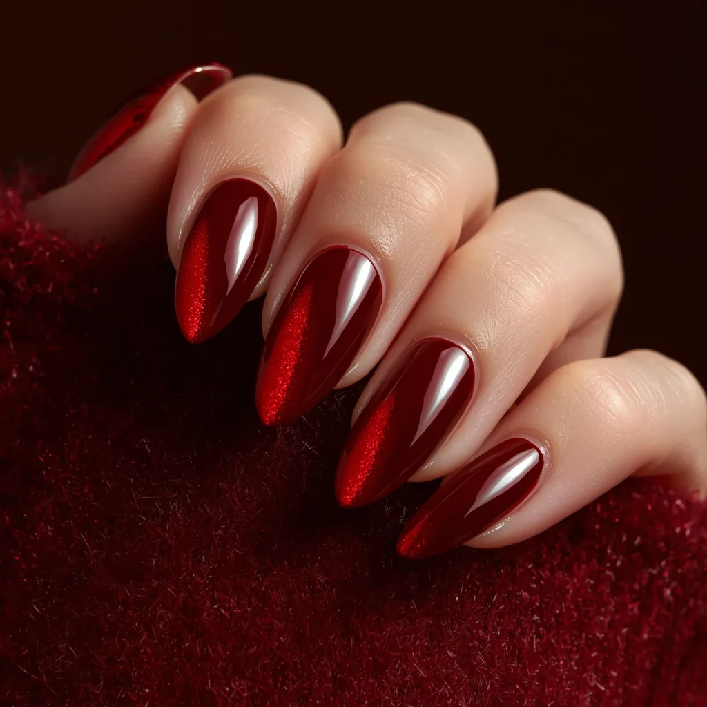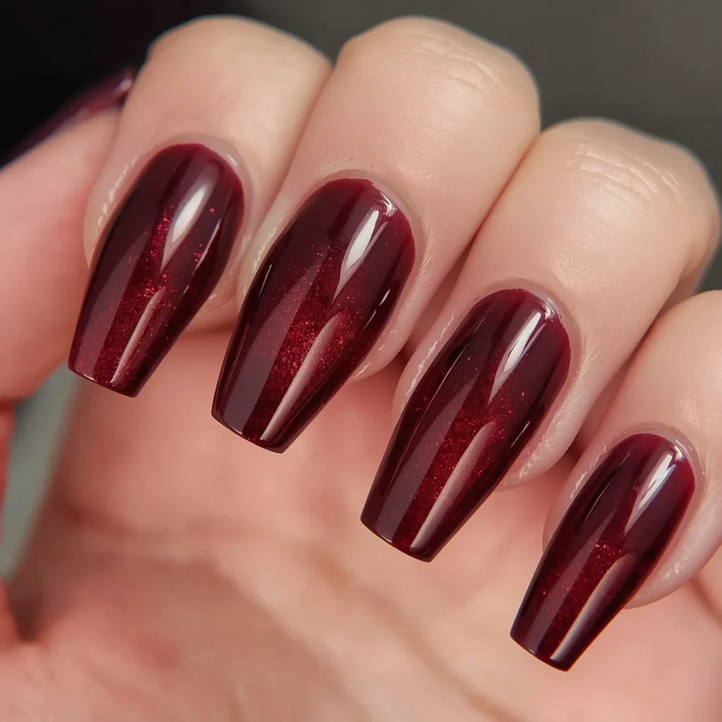 A gradient that flows from a deep burgundy at the base to a slightly lighter wine tone at the tips, creating dimensional depth through color transition rather than dramatic shift. Scattered metallic dust (gold, copper, or rose gold) throughout the gradient adds luxury shimmer, catching light and creating the effect of hidden jewels within the color. On oval or coffin nails with a high-gloss finish, this design reads as sophisticated, warm, and beautifully dimensional. The burgundy base is grounding and luxurious while the metallic dust adds contemporary high-fashion detail without overwhelming. This manicure celebrates the marriage of traditional jewel-tone warmth with modern finish innovation, classic color gradient with contemporary shimmer play. This is the manicure for those seeking warm statement color with dimensional luxury detail.