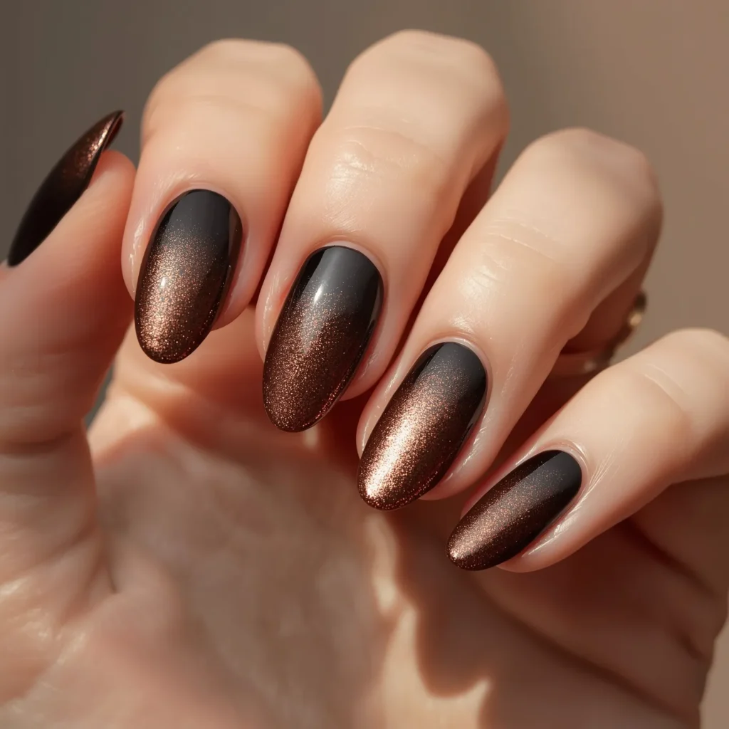 A gradient that moves from near-black charcoal at the base to a warm, lustrous rose gold at the tips, creating a beautiful contrast between dark sophistication and warm metallic luxury. On oval or coffin nails with a high-gloss finish, this design celebrates the marriage of depth and warmth, darkness and luminosity. The charcoal base provides grounding and drama while the rose gold tips add luxury and light without overwhelming the dark foundation. This manicure reads as fashion-forward, editorial, and beautifully balanced—it’s bold through color depth while remaining refined through the warm metallic transition. The effect is less gradient and more transitional luxury, moving from shadow to precious metal shimmer. This is the manicure for those seeking chromatic confidence paired with metallic sophistication.