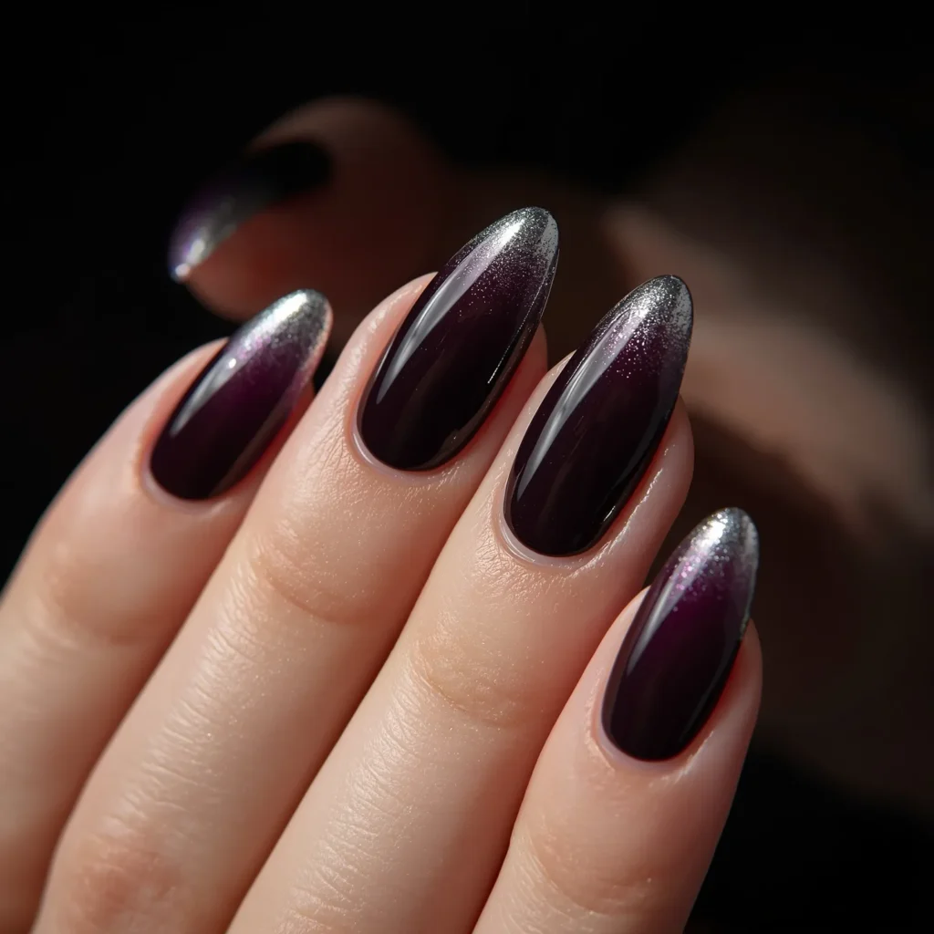 Deep Plum-Black Ombré with Silver Chrome Tips: Twilight Transition