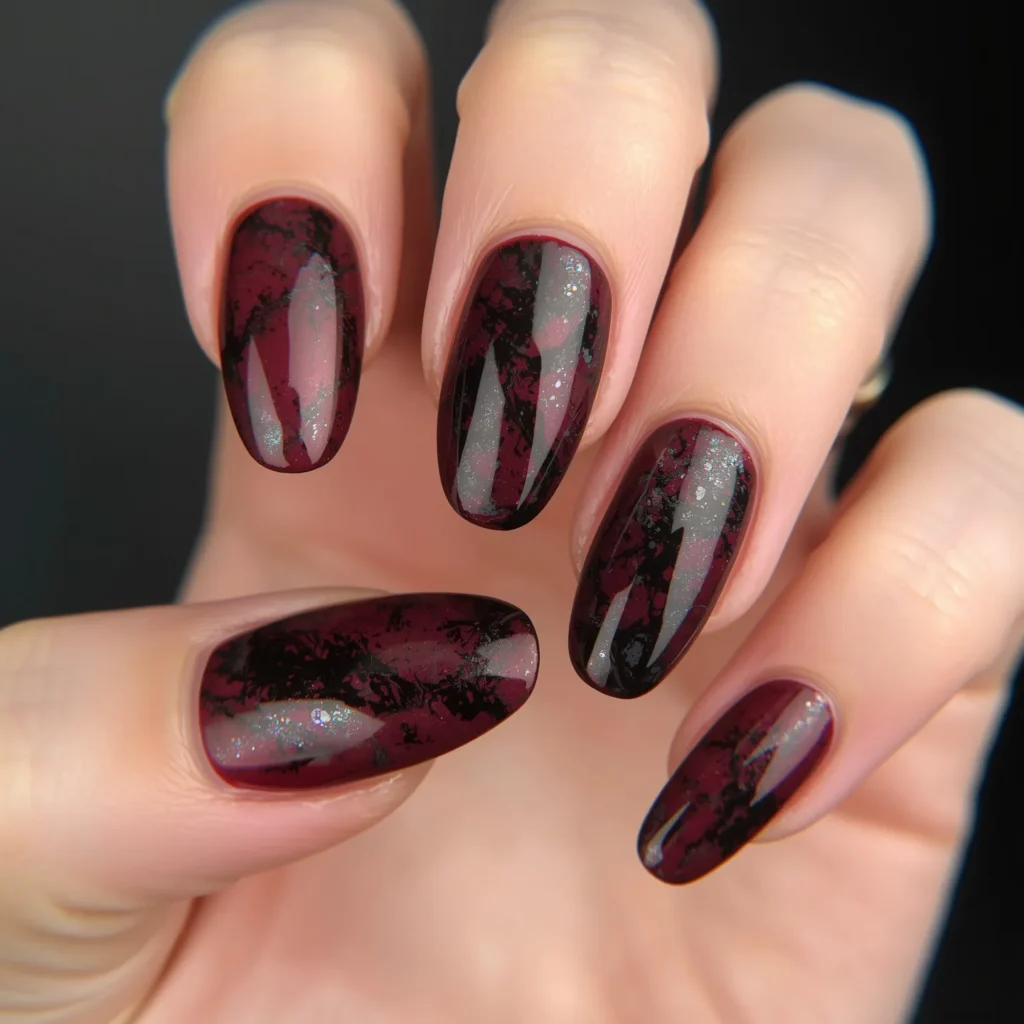 A deep wine or burgundy base features a marbled effect using darker burgundy, charcoal, or black creating organic, swirled patterns throughout—like marble stone or luxurious liquid mixing. On coffin or almond nails with a high-gloss finish, this design reads as sophisticated, artistic, and beautifully organic rather than geometric. The marbling effect adds visual interest and artistic intention while the wine base provides rich color and jewel-tone luxury. This manicure celebrates the marriage of solid color with abstract detail, traditional jewel-tone with artistic expression, contemporary nail art with refined restraint. The effect should feel natural and organic rather than perfectly controlled, suggesting luxury and depth through pattern rather than finish play.