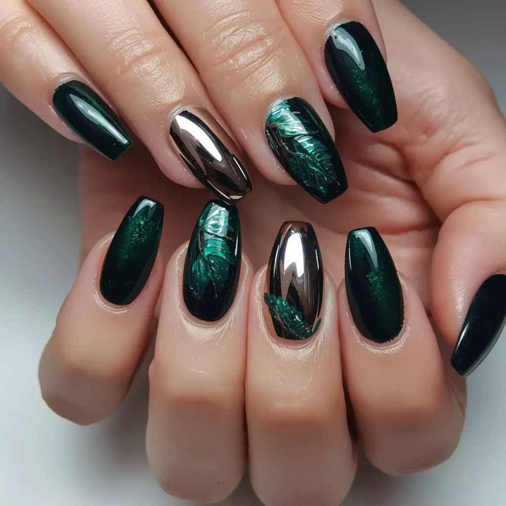 An emerald green so deep and saturated it reads as nearly black, paired with a chrome mirror finish on one or two accent nails that create a reflective surface appearing almost like a small mirror embedded in the nail. The emerald base provides mysterious botanical depth while the chrome creates contemporary luxury and literal reflectivity. On coffin or almond nails with a high-gloss finish on the emerald and ultra-shiny reflective finish on chrome accents, this design reads as fashion-forward, undeniably bold, and beautifully balanced. The effect is both traditional (jewel-tone gemstone color) and futuristic (mirror chrome finish). This is the manicure for those seeking statement color paired with high-impact contemporary technique, botanical depth with metallic luxury.