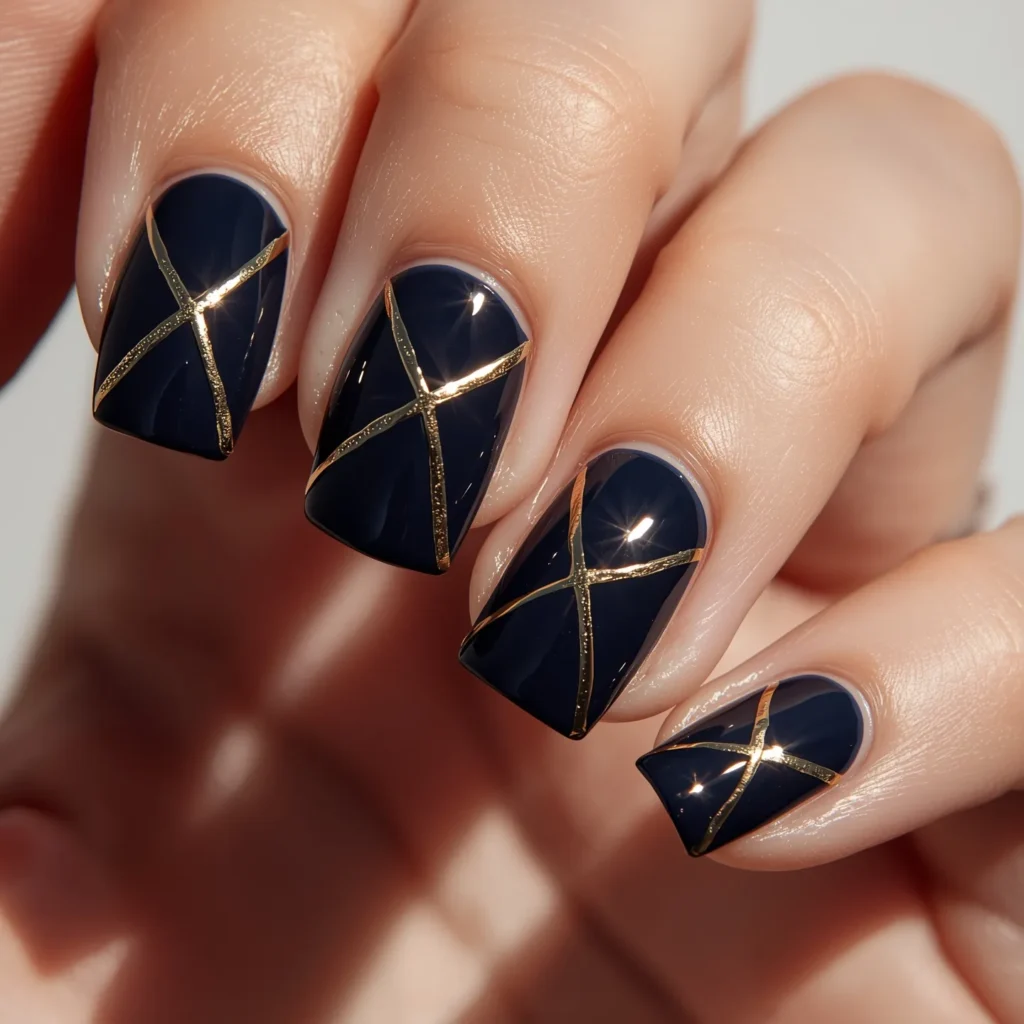 A midnight blue-black base on square nails with sharp, intentional gold geometric lines creating abstract patterns—thick enough to read clearly, thin enough to feel refined rather than heavy. The geometric elements might include angular intersections, clean triangular sections, or linear patterns creating visual structure and precision. The midnight blue-black provides mysterious depth while the gold creates luxury and light-catch. A high-gloss finish on the base with metallic shine on gold accents creates beautiful finish contrast. This manicure celebrates the marriage of traditional jewel-tone depth with contemporary geometric precision, architectural intention with precious metal luxury. This is the manicure for those seeking bold color paired with artistic precision and intentional design rather than elaborate pattern. It reads as fashion-forward, editorially sophisticated, and beautifully balanced between drama and refinement.