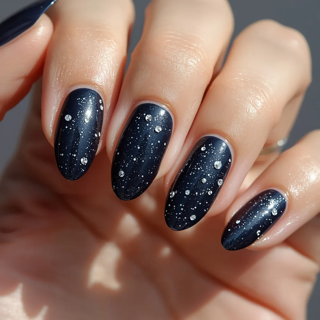 A deep navy base—not quite black, but dark enough to read as nearly midnight—features scattered diamond glitter or clear sparkly details that catch light like stars embedded within darkness. On almond or coffin nails with a high-gloss finish, this design reads as sophisticated, slightly glittery without being juvenile, and beautifully balanced between sparkle and depth. The navy provides grounding and mystery while the scattered diamond glitter adds luxury and light-play without requiring concentrated patterns. The effect should feel like discovering stars within darkness—subtle sparkle that becomes visible with light and movement. This is the manicure for those seeking statement color with understated sparkle, depth with luminous detail, sophistication with a touch of shimmer.