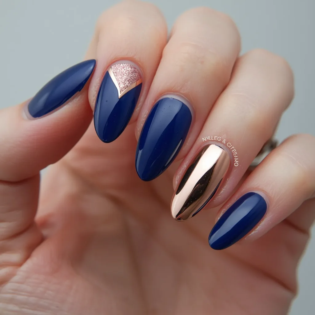 A rich sapphire blue base on almond nails pairs with a rose gold chrome finish on accent nails or geometric sections, creating beautiful temperature contrast—cool blue meeting warm metallic luxury. The sapphire should be saturated and deep, reading as a precious gemstone, while the rose gold chrome adds warmth and contemporary shimmer. On almond shapes with high-gloss finish on sapphire and ultra-shiny chrome on accents, this design reads as editorial, jeweled, and beautifully balanced. The effect is both traditional (gemstone color) and contemporary (chrome finish), both cool (sapphire) and warm (rose gold). This is the manicure for those seeking jewel-tone depth paired with precious metal luxury, traditional color with modern shine innovation.