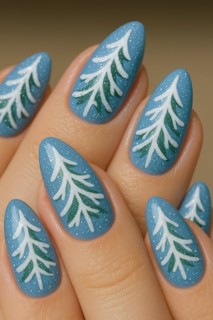 Blue nails with abstract snowy tree-inspired accents provide festive hints without being overt. Playful and stylish, suitable for winter and beyond.