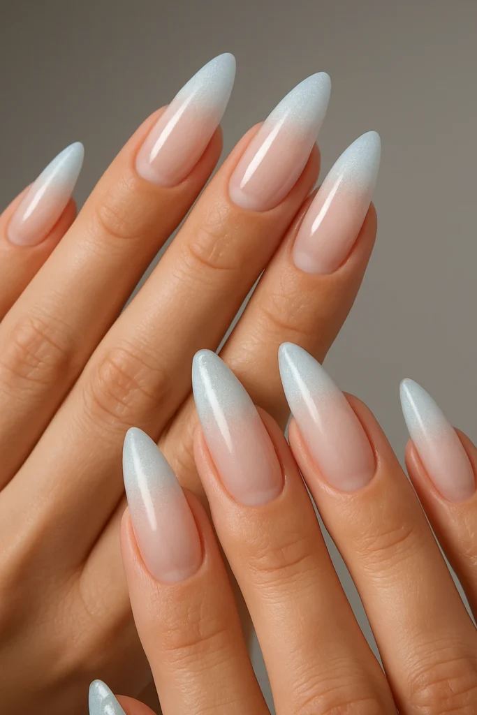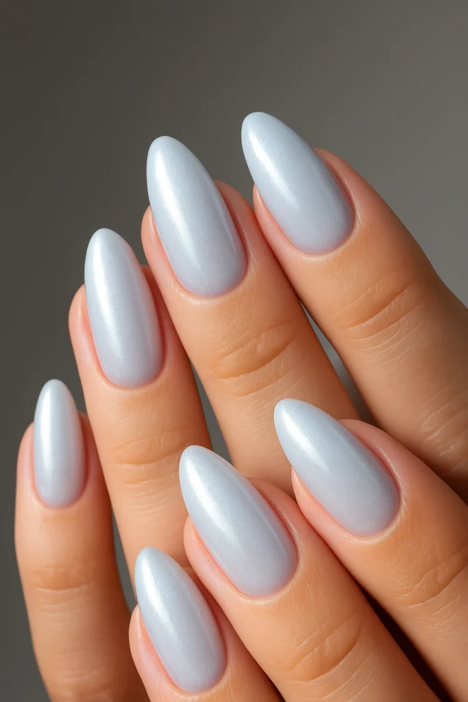 Light blue almond nails with pearlescent milky finish shimmer softly in the light, giving an icy winter-inspired look. Elegant and understated, these nails are ideal for everyday wear or special occasions.