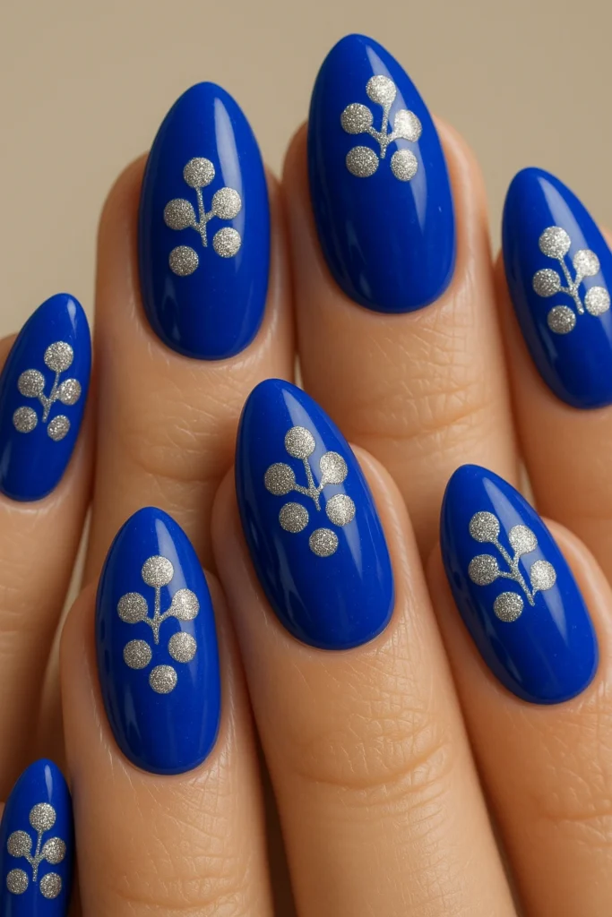 Cobalt blue almond nails feature clusters of silver shimmer “berries,” offering festive inspiration without overt holiday icons. The design is playful, elegant, and perfect for a standout winter look.