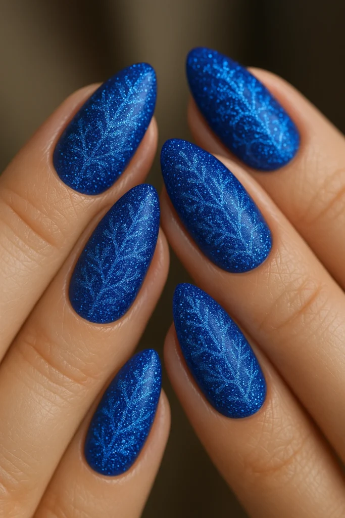 Cobalt blue almond nails sparkle with fine glitter and subtle snowflake-inspired accents, evoking winter elegance without being overtly festive. This manicure balances playful sparkle with sophisticated design.